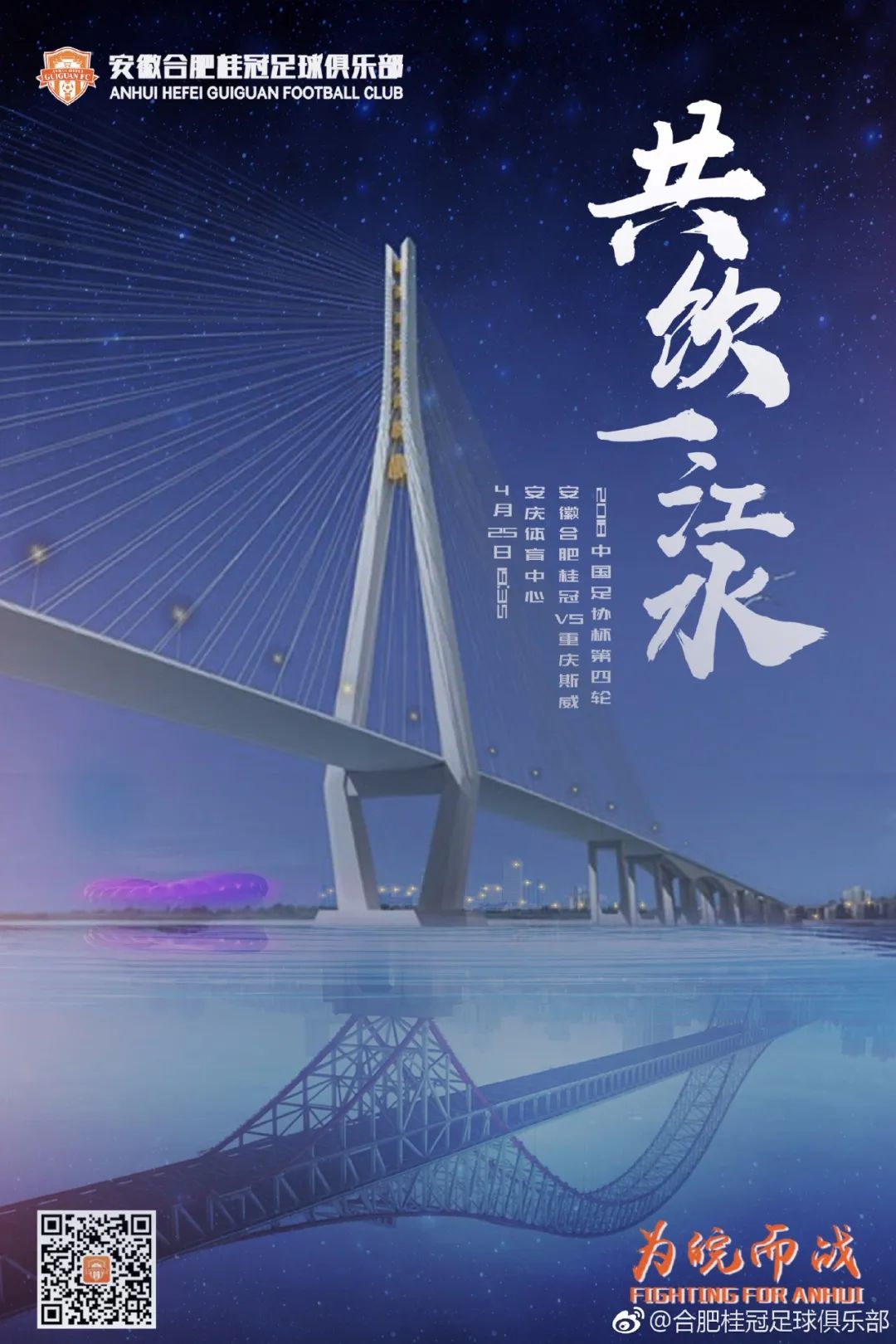 如2018赛季足协杯第四轮,安徽合肥桂冠对阵重庆斯威时,就长江的地理纽带作用绘制的江情暖意“共饮一江水”(上下分别为安庆长江大桥与重庆长江大桥)。